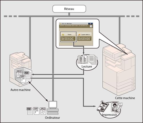 Il est possible d'enregistrer les originaux lus depuis la machine dans l'espace avancé d'une autre machine de la série imageRUNNER ADVANCE ouverte vers l'extérieur par le biais du réseau. Il est également possible de rappeler les fichiers enregistrés dans un espace avancé du réseau et de les imprimer à partir de la machine.