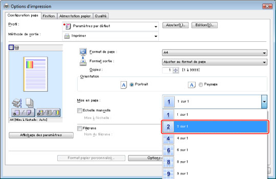 Sur la feuille [Configuration page], sélectionner [2 sur 1] sur la liste [Mise en page].