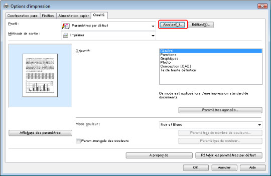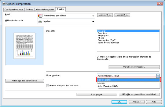 Sur la feuille [Qualité], sélectionner [Noir et blanc] sur la liste [Mode couleur].