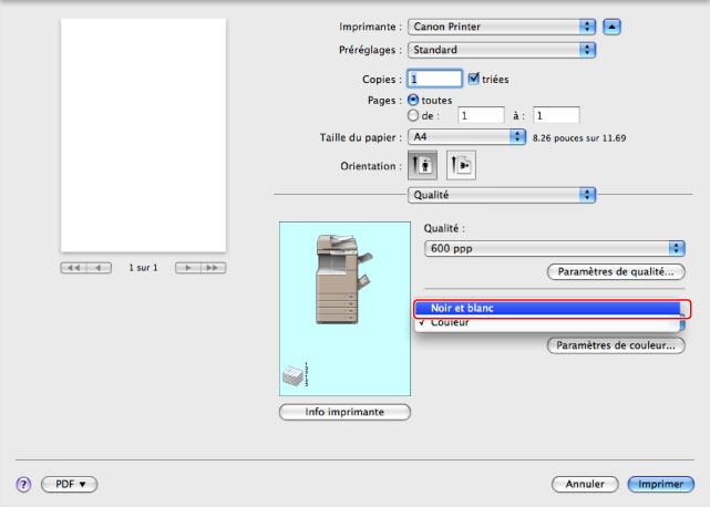 Sur le panneau [Qualité], sélectionner [Noir et blanc] sur la liste [Mode couleur].