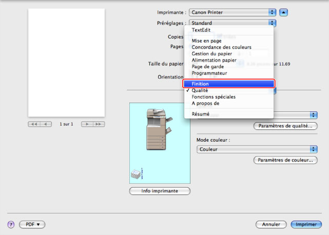Les réglages spécifiés dans les différents panneaux de la boîte de dialogue [Impression] du Mac peuvent être mémorisés sous forme de préréglages. Un préréglage est un ensemble des fonctions d'impression fréquemment utilisées enregistré comme un réglage unique. Il suffit ensuite de sélectionner un préréglage mémorisé en fonction des besoins d'impression.