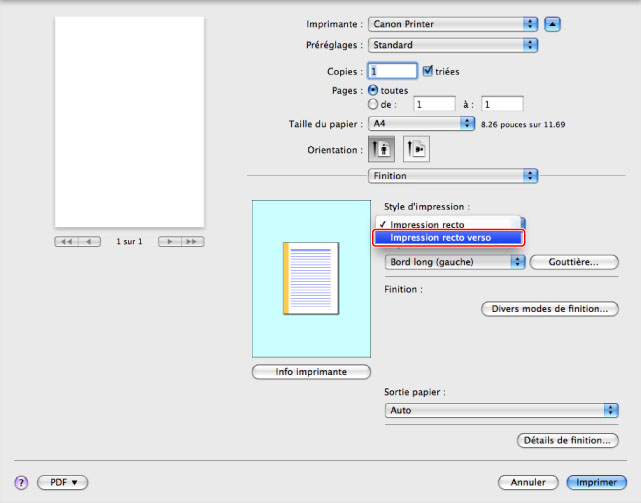 Dans le panneau [Finition], sélectionner [Impression recto verso] sur la liste [Style d'impression] .