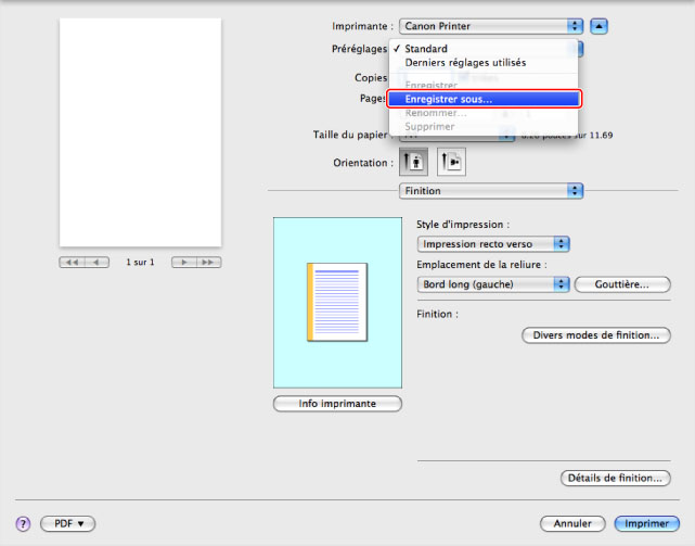 Si l'on utilise fréquemment les mêmes réglages d'impression, il est possible de les enregistrer sous forme de préréglage afin d'éviter d'avoir à effectuer chaque fois le paramétrage.