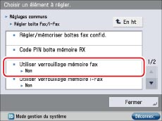 → [Réglages de fonction] → [Recevoir/Transférer] → [Réglages communs] → [Régler boîte Fax/I-Fax] → [Utiliser verrouillage mémoire fax].