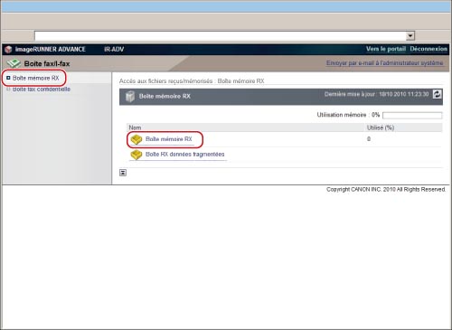 Cliquer sur [Boîte fax/I-fax] → [Boîte mémoire RX] → [Boîte mémoire RX].