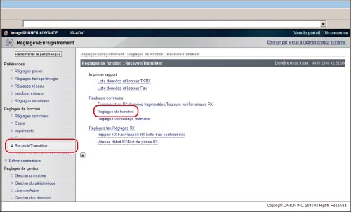 Accéder à l'interface utilisateur distante → cliquer sur [Réglages/Enregistrement] → [Recevoir/Transférer] → [Réglages de transfert].