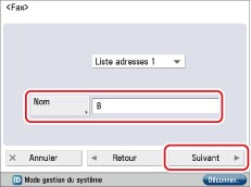 Appuyer sur [Mémor. nouv. dest.]. → [Fax] → saisir le nom "Bureau B" → appuyer sur [Suivant].