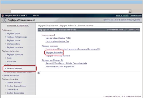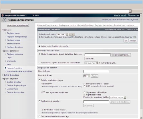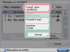 → [Réglages de fonction] → [Recevoir/Transférer] → [Réglages communs] → [Réglages de transfert] → [Autres opérations] → [Transf. sans conditions].