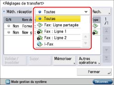 Il est possible de définir au maximum 1 000 conditions de transfert lorsque la Kit FAX bi-ligne est installée. Ce nombre représente la somme de [Fax : Ligne partagée], [Fax : Ligne 1] et [Fax : Ligne 2].