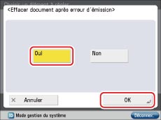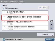 → [Réglages de fonction] → [Envoi]→ [Réglages communs] → [Supprimer document après erreur d'émission].