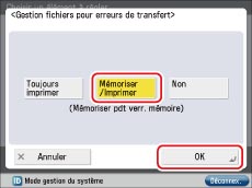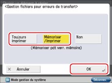 → [Réglages de fonction] → [Recevoir/Transférer] → [Réglages communs] → [Gestion fichiers pour erreurs de transfert] → sélectionner [Mémoriser/Imprimer] ou [Toujours imprimer] → appuyer sur [OK].