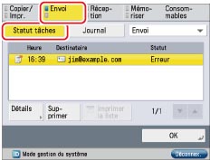 Le statut de toutes les tâches d'envoi (fax, fax via Internet, transmission de fichiers, e-mail et transfert) est affiché, et <Erreur> apparaît pour les erreurs de transfert de la même manière que pour les autres erreurs de transmission.