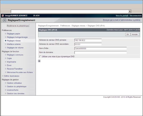 → [Préférences] → [Réseau] → [Réglages TCP/IP] → [Réglages DNS].Si l'émission continue de paquets de la machine imageRUNNER ADVANCE vers le serveur DNS provoque un trafic réseau excessif, désactiver la mise à jour dynamique DNS une fois la communication terminée.