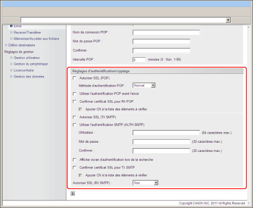 Sélectionner ce réglage afin d'utiliser SSL pour la communication POP. Sélectionner la méthode d'authentification POP sur la liste en fonction du F.A.I.