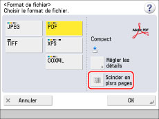 Si [PDF], [XPS], [TIFF] ou [OOXML] est sélectionné, utiliser le mode Scinder en plsrs pages :