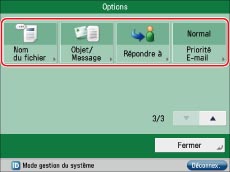 Seuls les réglages mémorisés peuvent être sélectionnés pour "Nom de l'expéditeur" et "Répondre à". Il est impossible de saisir un nouveau destinataire dans l'écran Options. Mémoriser le destinataire dans Réglages/Enregistrement. Le "Nom de l'expéditeur" affiché à l'écran de réception est le nom de l'unité défini pour la machine imageRUNNER ADVANCE chargée de l'envoi. Le réglage "Nom de l'expéditeur" n'est pas renseigné.