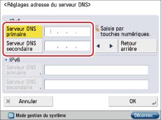 → [Préférences] → [Réseau] → [Réglages TCP/IP] → [Réglages DNS] → [Réglages adresse du serveur DNS].