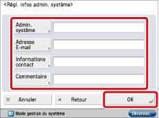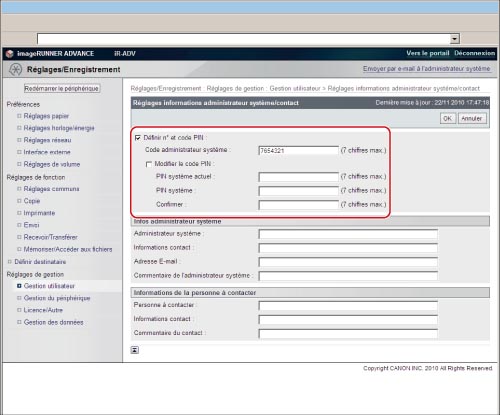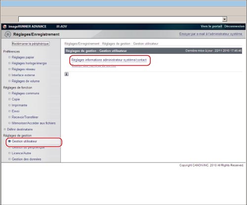Accéder à l'interface utilisateur distante → cliquer sur [Réglages/Enregistrement] → [Gestion utilisateur] → [Réglages informations sur administrateur système/personne à contacter].
