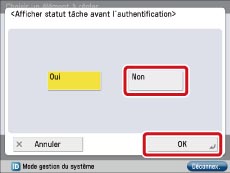Appuyer sur [Afficher statut tâche avant l'authentification] → [Non] → [OK].