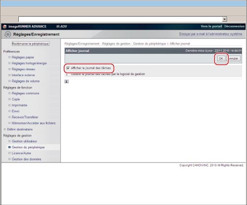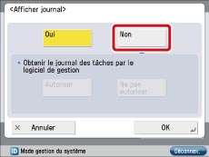 Sélectionner [Autoriser] ou [Ne pas autoriser] pour <Obtenir le journal des tâches par le logiciel de gestion> → appuyer sur [OK].