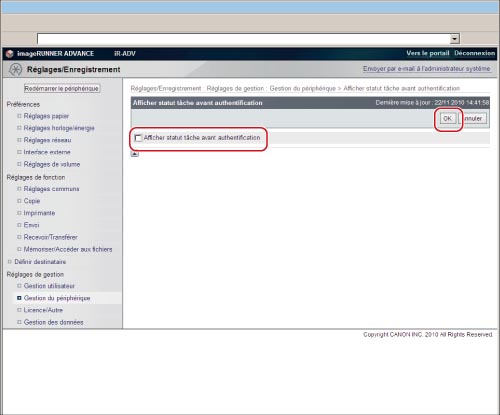 Pour spécifier le statut des tâches avant les réglages de l'écran de l'authentification, cliquer sur [Afficher statut tâche avant l'authentification] → désélectionner [Afficher statut tâche avant l'authentification] → cliquer sur [OK].