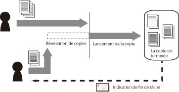 Il est impossible de traiter une nouvelle tâche tant que celle en cours n'est pas terminée. Par exemple, si un tirage volumineux est en cours de traitement, il faut attendre qu'il soit terminé. Dans ce cas, le mode Copie réservée peut être utilisé pour lire les originaux pendant le traitement d'une copie et la copie démarre alors dès que la tâche en cours est terminée. Pour faciliter le traitement de la copie, demander de recevoir une notification lorsque la copie est terminée.