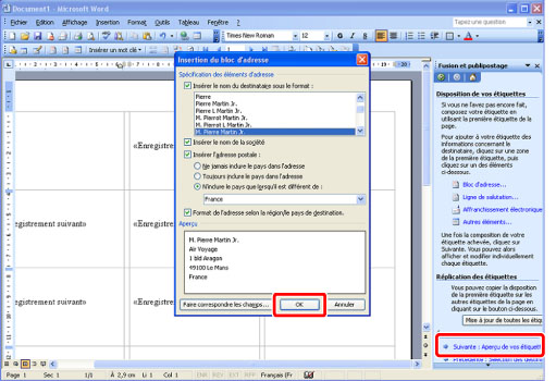 Sélectionner la taille des étiquettes pour [Tailles internationales] → cliquer sur [OK] → [Suivante].