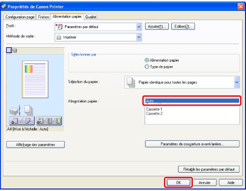 Cliquer sur l'onglet [Alimentation papier] → sélectionner la source papier qui contient les étiquettes → cliquer sur [OK].