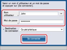 Dans l'écran de connexion d'une machine dotée d'iW Function Flow, renseigner les champs [Nom utilisateur] et [Mot de passe] → appuyer sur [Se connecter].