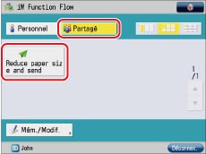 Dans l'écran des fonctions de base de iW Function Flow, sélectionner [Partagé] → appuyer sur [Reduce paper size and send].