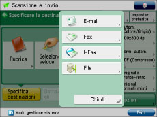 È possibile impostare la macchina in modo da visualizzare la funzione Fax nella schermata Menu principale. Se si desidera visualizzare la funzione Fax nella schermata Menu Principale, è possibile se visualizzare o meno la funzione in [Scansione e invio]. Visualizzando la funzione Fax in [Scansione e invio], è possibile eseguire l'invio a varie destinazioni contemporaneamente utilizzando diversi metodi di invio, ad esempio e-mail e I-fax.