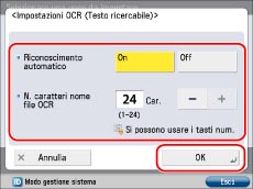 Selezionare [On] per <Riconoscimento automatico> → selezionare [-] o [+] per <N. caratteri nome file OCR> per impostare il numero di caratteri per il nome file → selezionare [OK].