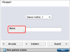 La funzione Indirizzo di gruppo consente di creare un gruppo. In un singolo gruppo è possibile registrare diversi tipi di destinazioni (ad esempio le destinazioni per e-mail, I-fax o file server).