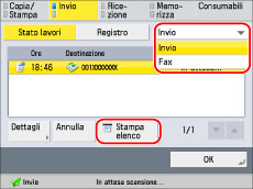 Sull'elenco dei lavori di invio viene stampata una lista delle trasmissioni fax, e-mail, I-fax e file server.
