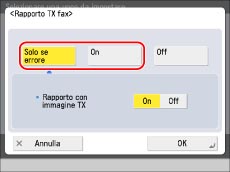 Per stampare parte del documento inviato sul Rapporto TX fax, selezionare [On] per <Rapporto con immagine TX>.