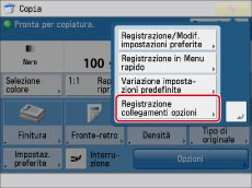 In [Opzioni] è possibile creare selezioni veloci per le funzioni utilizzate di frequente. È inoltre possibile registrare selezioni veloci nelle [Impostaz. preferite]. Per informazioni sulle impostazioni preferite, vedere