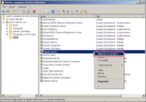 Fare clic con il pulsante destro del mouse sull'account dell'utente che si desidera aggiungere al gruppo 'Canon Peripheral Admins'.