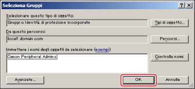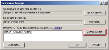 Immettere 'Canon Peripheral Admins' nella finestra di selezione del gruppo → fare clic su [Controlla nomi].