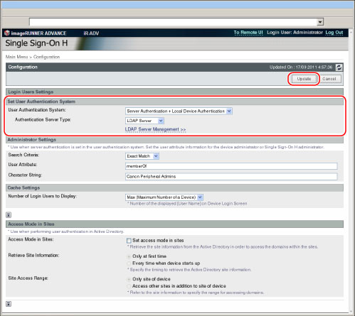 L'impostazione predefinita è 'Server Authentication + Local Device Authentication'. Per aumentare la sicurezza, impostare il sistema di autenticazione utente su 'Server Authentication' o cambiare il nome utente e la password dell'amministratore di Local Device Authentication subito dopo aver iniziato a utilizzare SSO-H.