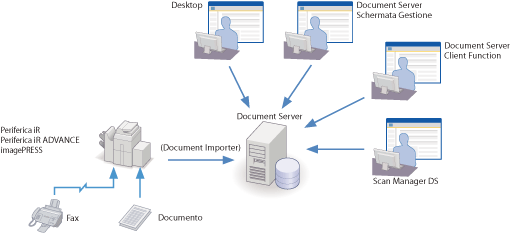 Document Server è un server per la gestione di documenti che utilizza come client Document Server Client Function o Desktop. Oltre a creare documenti utilizzando questi client, permette anche di memorizzare documenti acquisiti attraverso la rete, come ad esempio quando si utilizzano periferiche multifunzioni digitali della serie IR e scanner di documenti della serie DR. Questo rende possibile la creazione di un sistema avanzato di gestione dei documenti in grado di gestire in maniera efficiente i documenti memorizzati.