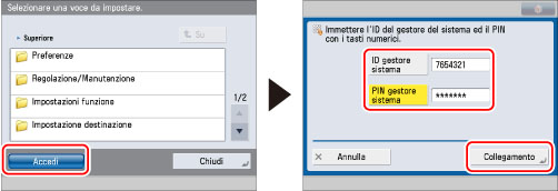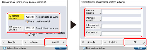 Per default, le impostazioni del gestore del sistema (ID gestore sistema/PIN sistema) sono impostate sulla macchina. Pertanto, l'amministratore deve collegarsi immettendo l'ID del gestore del sistema e il PIN gestore sistema. L'impostazione predefinita per ID gestore sistema e PIN gestore sistema è '7654321'. Si consiglia di modificare sia l'ID del gestore del sistema sia il PIN gestore sistema.