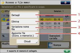 Premere per visualizzare il menu per aggiungere un file o visualizzare i dettagli del file selezionato, eliminarlo o rinominarlo.