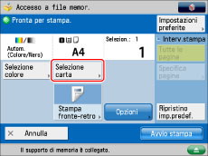 Se per il lavoro in corso la stampa viene alimentata dal vassoio multiuso, per il lavoro successivo è possibile selezionare la carta da [Variaz. carta vas.multiuso]. (Vedere "Prenotazione di un lavoro di stampa mediante un vassoio multiuso".)