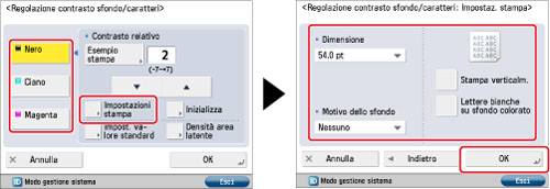 Come impostazione predefinita, per l'esecuzione di una stampa di esempio non è selezionato [Lettere bianche su sfondo colorato] nella schermata Impostazioni stampa. Se è selezionato [Lettere bianche su sfondo colorato], impostare [Impost. valore standard] per la densità del testo e [Densità area latente] per la densità dello sfondo.