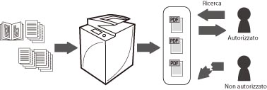Mediante il modo PDF ricercabile, è possibile convertire documenti cartacei in file PDF con testo ricercabile. Ad esempio, è possibile risparmiare spazio digitalizzando i documenti cartacei come un curriculum vitae. La crittografia di file PDF consente di impedire l'apertura dei file e la ricerca di informazioni a utenti non autorizzati. Impostando una password quando si inviano i documenti acquisiti, si può impedire la perdita di informazioni che si verifica quando i documenti vengono inviati alla destinazione errata.