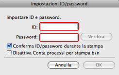Nella finestra di dialogo [Impostazioni ID/Password], impostare l'ID e la password registrati al punto 4 di "Impostazioni della macchina".