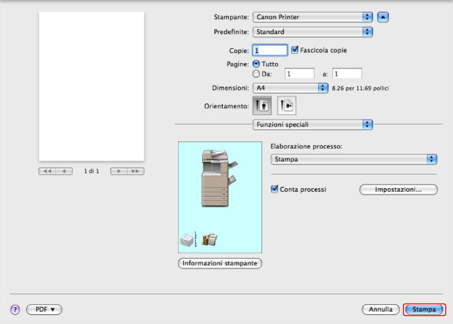 Selezionare la stampante da utilizzare → selezionare il pannello [Funzioni speciali].