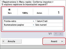Premere [Menu rapido] sulla macchina nella quale sono state importate le impostazioni → premere il pulsante che contiene le impostazioni registrate.