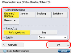 Wenn Sie [Kopieren/Drucken], [Auftragsstatus], [Druck] für <Standardanzeige (Status Monitor/Abbruch)> einstellen: