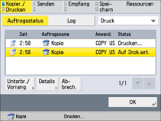 Wenn Sie [Kopieren/Drucken], [Senden], oder [Empfang] wählen, können Sie den Typ des Auftrags wählen, der angezeigt wird.